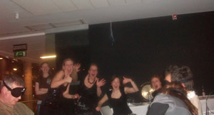 I took some pictures – with my blindfold on. I was trying to be somewhat discreet but again – tough to be discreet when you’re blindfolded. It looks as if folks caught me and posed for the picture. Our new friends took a picture of us. Really I can’t even tell you how hard it is to sit in a room when you don’t know the layout. Even though I *think* I know what room we were in, I didn’t have a feel about how many tables there were or where folks were sitting or where the kitchen was or the waiters…