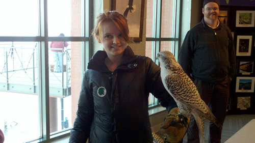 We got to watch them feed an eagle. That was gross but cool. The eagle got to choose between rabbit meat and rat. She went for rabbit meet. I think the rat would have been grosser to see. The rabbit looked like raw meat; the rat was recognizable as a rat. Lily and Patrick got to hold a falcon, wearing the falconer’s glove.