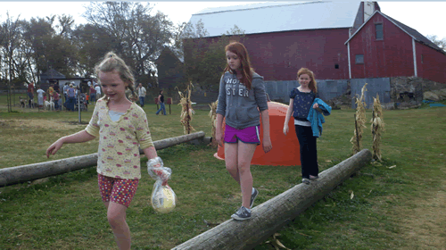 We get to see (and hold!) baby chicks and bunnies. You know how grandpa and I are suckers for cute and fluffy! You get to ride in a go-cart kind of thing down a hill. Really I could spend my whole day doing that. Then there are contests – like sack races – ask me who the winner was. You can swing on the hay bale thing – if you’re under 14. And best of all is the pumpkin trebuchet. We love seeing the pumpkin catapult into the lake. Love to hear the explanation of how it works each year.